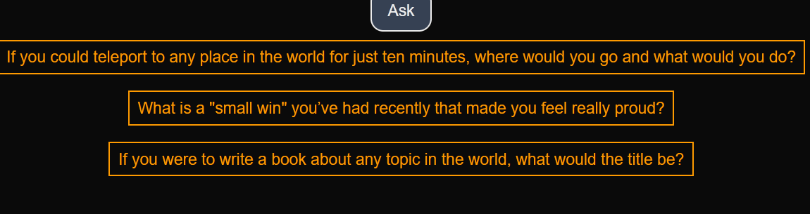 const prompt = "Create a list of three open-ended and engaging questions formatted as a single string. Each question shoould be seperated by '||'. These questions are for an anonymous social messaging platform, like Qooh.me, and should be suitable for a diverse audience. Avoid personal and snsitive topics, focusing instead on universal themes that encourag friendly interaction. Foor example, your output should be structured like this: 'What's a hobby you've recently started? || if you could have dinneer with any historical figure, who would it be? || What's a hobby you've recently started? If you could have dinner with any historical figure, who would it be? || What's a simple thing that maes you happy?'. Ensure the questions are intriguing, foster curiositty, and contribute to a positive and welcoming consersatin enviornment";